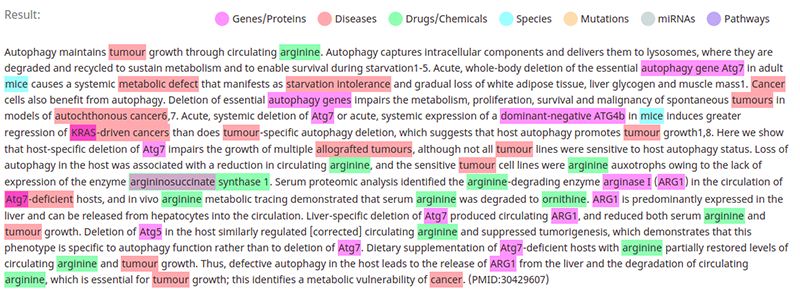 I’ve been looking for a decent open-source pre-trained biomedical named entity linking for some time. Lots of NLP models focus on extracting only a specific subset of medical concepts like genes or diseases. It is even rarer to find a model that detects most medical concepts and links them to a target knowledge base. Luckily I’ve stumbled upon BERN[1], a neural biomedical entity recognition and multi-type normalization tool. If I understand correctly, it is a fine-tuned BioBert model with various named entity linking models integrated for mapping concepts to biomedical target knowledge bases. Not only that, but they also provide a free REST endpoint, so we don’t have to deal with the headache of getting the dependencies and the model to work. The biomedical named entity recognition visualization I’ve used above was created using the BERN model, so we know it detects genes, diseases, drugs, species, mutations, and pathways in the text.