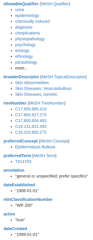 Here is a screenshot of the available information on the MeSH website for Epidermolysis bullosa. As mentioned, I’m not a medical doctor, so I don’t know exactly what would be the best way to model this information in a graph. However, I’ll show you how to retrieve this information in Neo4j using the apoc.load.json procedure to fetch the information from the MeSH REST endpoint. And then, you can ask a domain expert to help you model this information.
