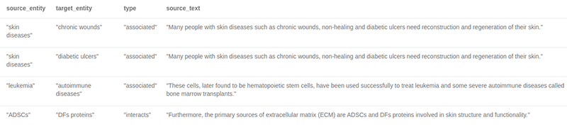 With the zero-shot relation extractor, you can define which relations you would like to detect. In this example, I’ve used the associated and interacts relationships. I’ve also tried more specific relationship types such as treats, causes, and others, but the results were not great.