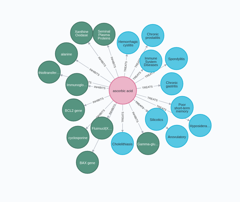In the above visualization, we have ascorbic acid, also known as vitamin C, and some of its relations to other concepts. For example, it shows that vitamin C could be used to treat chronic gastritis.