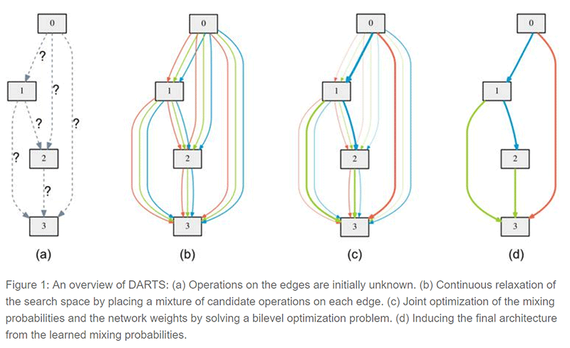 Differentiable architecture search (DARTS). This research was recently released from a team at Carnegie Mellon University and DeepMind, and I’m excited about the idea. DARTS assumes the space of candidate architectures is continuous, not discrete, and this allows it to use gradient-based aproaches, which are vastly more efficient than the inefficient black-box search used by most neural architecture search algorithms.