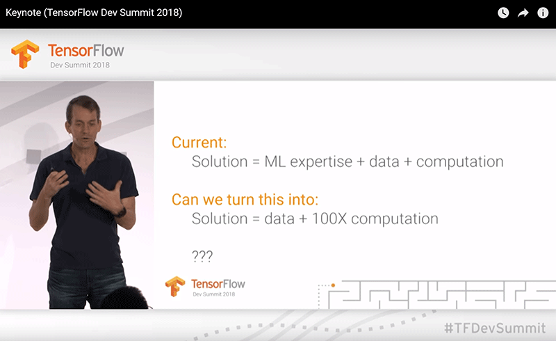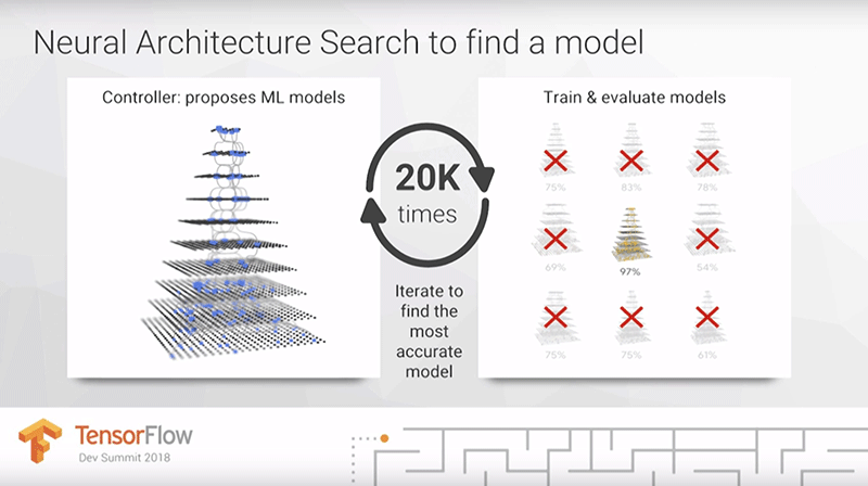 In his TensorFlow DevSummit keynote (starts around 22:20), Jeff Dean suggested that a significant part of deep learning work is trying out different architectures. This was the only step of machine learning that Dean highlighted in his short talk, and I was surprised by his emphasis. Sundar Pichai’s blog post contained a similar assertion.