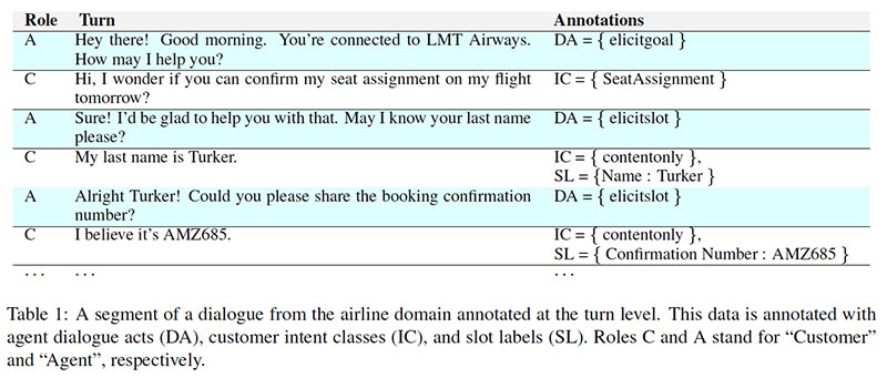- The agents’ utterances are annotated with generic class labels common across all domains, while customers’ utterances are labeled with intent classes and appropriate slot labels.