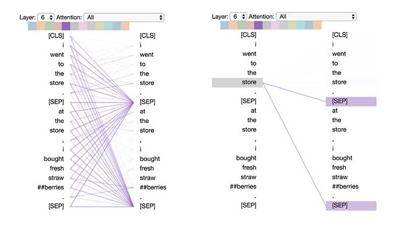 In this pattern, attention is paid to identical or related words in the other sentence. For example, most of attention for “store” in the second sentence is directed to “store” in the first sentence. One can imagine this being particularly helpful for the next sentence prediction task (part of BERT’s pre-training), because it helps identify relationships between sentences.