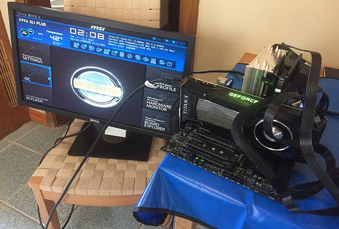 Patience helps. For about 15 minutes, my monitor wouldn’t display the BIOS despite the Titan X being powered on. Eventually figured out the problem was a power supply issue and fixed.