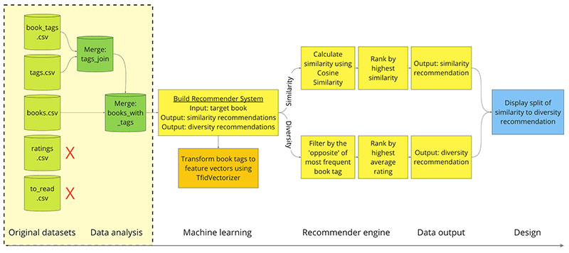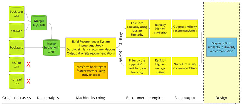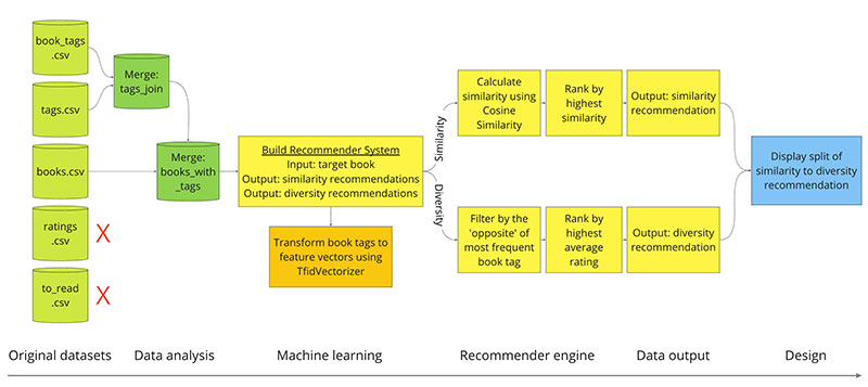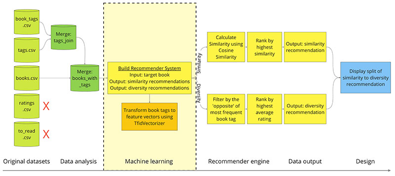 Books is the ideal industry to explore because there is a clear distinction between book categories and potential revenue, unlike music where the dollar value for listening to new genres is less clear. The goal is to build a recommender system where we input a book and have it output: