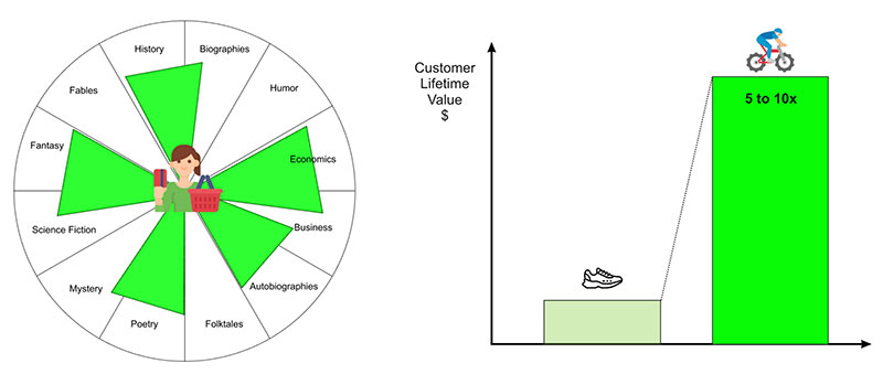 Why is this diverse consumer behavior not better reflected in our technology’s behavior? In fact, if a business is able to convert a customer into trying a new category, such as turning a running customer into a new road biking customer, that customer is likely to spend 5 to 10x more through onboarding and purchases in that new activity. For every diverse category a business is not recommending, that is lost sales and engagement.