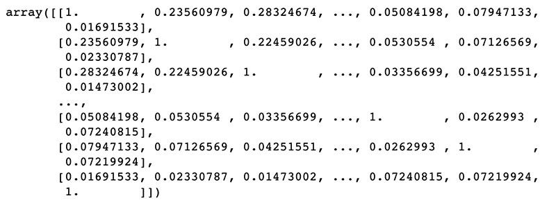 # Use numeric values to find similarities from sklearn.metrics.pairwise import linear_kernel cosine_sim = linear_kernel(tfidf_matrix, tfidf_matrix) cosine_sim