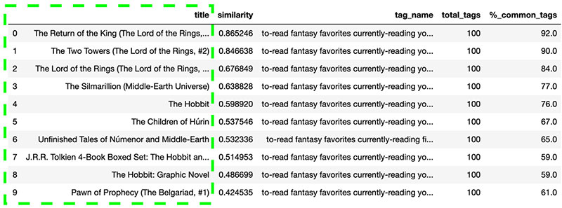 We get a list of the top 10 most similar books to Lord of the Rings based on book tags. The recommendations look nearly identical to Amazon’s website: