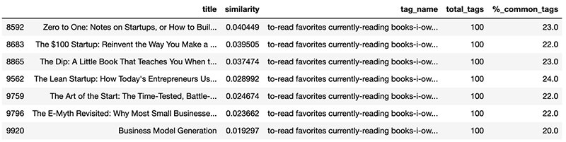 This narrows down the list and only include books that contain “non-fiction”, “economics”, or “entrepreneurial” in the book tags. To ensure our reader is recommended a good book, we merge ‘average_rating’ back into the dataset and sort the results by the highest average book rating.