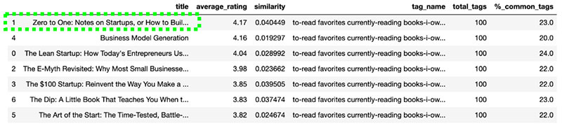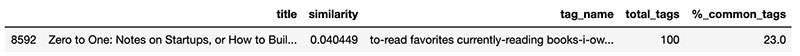 # Find Zero to One book lor_recs[lor_recs.title == 'Zero to One: Notes on Startups, or How to Build the Future']