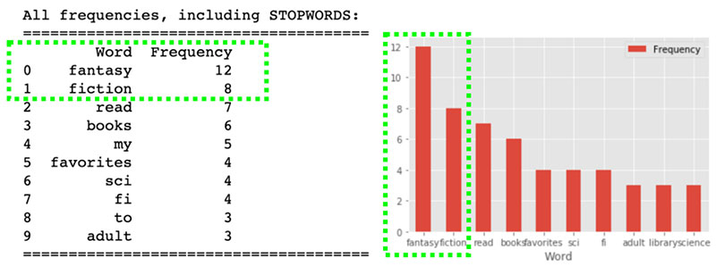 Since we want diversity and variety, we can take the most frequent words “fantasy” and “fiction” and filter by unlike or different words in the context of book genres. These might be words like non-fiction, economics, or entrepreneurial.