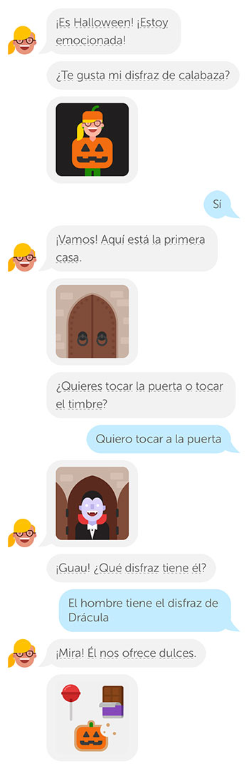 - The app syncs with real-world occasions and holidays. For Halloween, we encountered bots in pumpkin, dentist, witch and vampire costumes. Keeping topics timely drives user interest, engagement, and learning and equips them with vocabulary they can use right away.