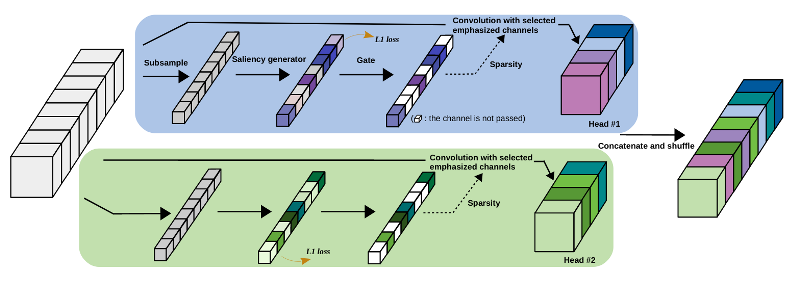 In order to adaptively select the most related input channels for each group while keeping the full structure of the original networks, the authors propose dynamic group convolution (DGC). DCG consists of two heads, in each head, there is a saliency score generator that assigns an importance score to each channel. Using these scores, the channels with low importance scores are pruned. Then the normal convolution is conducted based on the selected subset of input channels generating the output channels in each head. Finally, the output channels from different heads are concatenated and shuffled.