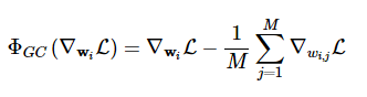 The GC operator, given the computed gradients, first computes the mean of the gradient vectors as illustrated above, then removes the mean of them. Formally, for a weight vector
