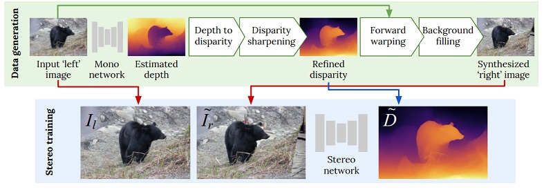 The paper proposed a novel and fully automatic pipeline for generating stereo training data from unstructured collections of single images given a depth-from-color model, requiring no synthetic data or stereo pairs of images to train. Using a depth estimation network. First, a given left input image is converted into a synthesized right image by a forward wrapping operation using the depth disparity. Then, with stereo pairs of images, the stereo network can then be trained in a supervised manner, resulting in a well generalizable model.