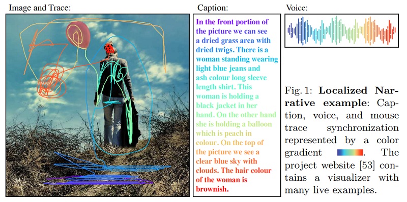 The paper proposes a new and efficient form of multi-modal image annotations for connecting vision and language called Localized Narratives. Localized Narratives are generated by asking the annotators to describe an image with their voice while simultaneously hovering their mouse over the region they are describing. For instance, as shown in the figure above, the annotator says “woman” while using their mouse to indicate her spatial extent, thus providing visual grounding for this noun. Later they move the mouse from the woman to the balloon following its string, saying “holding”. This provides direct visual grounding of this relation. They also describe attributes like “clear blue sky” and “light blue jeans”. Since voice is synchronized to the mouse pointer, the image location of every single word in the description can be determined. This provides dense visual grounding in the form of a mouse trace segment for each word. This rich from of annotation with multiple modalities (ie., image, text, speech and grounding) can be used to for different tasks such as text-to-image generation, visual question answering and voice-driven environnement navigation. Or for a more fine-grained control of tasks, such conditioning captions on specific parts of the image, which can be used by a person with imperfect vision to get descriptions of specific parts by hovering their finger on the image.