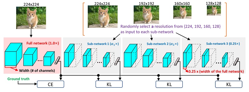 This paper proposes to leverage both the network scale and the input scale to find a good trade-off between the accuracy and the computational efficiency. As illustrated above, for a given training iteration, four sub-networks are sampled, a full one and three sub-networks with varying widths. The full network is trained on the original size of the image with the ground-truth labels using the standard cross-entropy loss, while the rest of the sub-networks are trained with randomly down-scaled version of the input image using KL divergence loss between their outputs and the output of the full network (ie., a distillation loss). This way, each sub-network will be able to learn multi-scale representations from both the input scale and the network scale. During deployment, and given a specific resource constraint, the optimal combination of network scale and input scale can be chosen for inference.