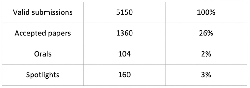 The trends of earlier years continued with more than 200% increase in submitted papers compared to the 2018 conference, and with a similar number of papers to CVPR 2020. As expected, this increase is joined by a corresponding increase in the number of reviewers and area chairs to accommodate this expansion.