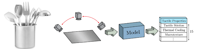 In order to simulate such a mental model in a more direct manner, the paper proposes to estimate the physical properties directly, allowing attributes of objects to be utilized directly. First, the authors propose a dataset of 400+ surface image sequences and tactile property measurements. Since when estimating surface properties, people often unconsciously move their heads, acquiring multiple views of a surface, the captured images sequences comprise multiple viewing angles for each material surface. Then, they propose a cross-modal framework for learning the complex mapping for visual cues to the tactile properties. The training objective of the model is to generate precise tactile properties estimates given vision information. Both visual and tactile information are embedded into a shared latent space through separate encoder networks. A generator function then estimates tactile property values from the embedded visual vector. The discriminator network learns to predict whether a tactile-visual pair is a real or synthetic example. During inference, the encoder-generator pair is used to infer the tactile properties if the input images.