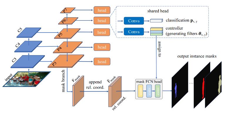 In this paper, the authors propose to adapt FCNs used for semantic segmentation for instance segmentation. For effective instance segmentation, FCNs require two type of information, appearance information to categorize objects and location information to distinguish multiple objects belonging to the same category. The proposed network, called CondInst (conditional convolutions for instance segmentation), is a network based on CondConv and HyperNetworks, where for each instance, a sub-network will generate the mask FCN head’s weights conditioned on the center area of each instance, which are then used to predict the mask of the given instance. Specifically, as shown above, the network consists of multiple heads applied at multiple scales of the feature map. Each head predicts the class of a given instance at pre-defined positions, and the network’s weights to be used by the mask FCN head. Then the mask prediction is done using the parameters produced by each head.