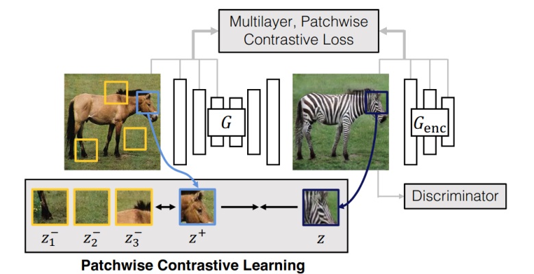 Contrastive Unpaired Translation (CUT) aims to learn such an embedding space. In addition to the standard GaN loss where the generator is trained to generate realistic translated images while the discriminator tries to differentiate between the translate images and real ones. An additional loss that pushes for similar embeddings between two corresponding patches from the input and translated image in used. Optimized with a contrastive objective which pulls the embeddings of the two corresponding patches, while pushing away the embedding of a give patch and its negatives which are randomly sampled patches (ie., only internal patches from the same input image are used, external ones from other images decrease the performances).