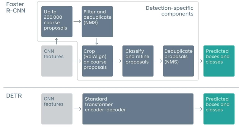 The task of object detection consists of localizing and classifying objects visible given an input image. The popular framework for object detection consist of pre-defining a set of boxes (ie., a set of geometric priors like anchors or region proposals), which are first classified, followed by a regression step to the adjust the dimensions of the predefined box, and then a post-processing step to remove duplicate predictions. However, this approach requires selecting a subset of candidate boxes to classify, and is not typically end-to-end differentiable. In this paper, the authors propose DETR (DEtection TRansformer), an end-to-end fully differentiable approach with no geometric priors. Bellow is a comparison of DETR and Faster R-CNN pipelines (image taken from the authors presentation), highlighting the holistic nature of the approach.