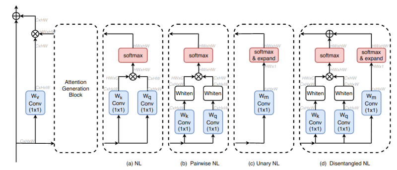 (referred to as a query pixel) as the sum of two term: a pairwise term, which is a whitened dot product term representing the pure pairwise relation between query and key pixels, and a unary term, representing where a given key pixel has the same impact on all query pixels. Then, to understand the impact of each term, they train using either one, and find that pair-wise term is responsible for the category information, while the unary is responsible for boundary information. However, by analyzing the gradient of the non-local block, when the two are combined in the normal attention operator, their gradients are multiplied, so if the gradients of one of the two term is zero, the non-zero gradients of the other wont have any contribution. To solve this, the authors proposed a disentangled version of the non-local, where each term is optimized separately.