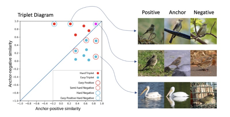 Deep metric learning optimizes an embedding function that maps semantically similar images to relatively nearby locations and maps semantically dissimilar images to distant locations. A popular way to learn the mapping is to define a loss function based on triplets of images: an anchor image, a positive image from the same class, and a negative image from a different class. The model is then penalized when the anchor is mapped closer to the negative image than it is to the positive image. However, during optimization, most triplet candidates already have the anchor much closer to the positive than the negative making them redundant. On the other hand, optimizing with the hardest negative examples leads to bad local minima in the early phase of the training. This is because in this case, the anchor-negative similarity is larger than the anchor-positive similarity as measured by the cosine similarity, ie., dot product between normalized feature vectors.