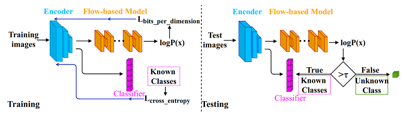 In this paper, the authors use Flow-based model to tackle the problem of open-set classification. Flow-based are able to fit a probability distribution to training samples in an unsupervised manner via maximum likelihood estimation. The flow model can then be used to predict the probability density of each example. When the probability density of an input sample is large, it is likely to be part of the training distribution with a known class, and outliers will have a small density value. While previous methods stacked a classifier on top of the flow model, the authors propose to learn a joint embedding for both the flow model and the classifier since the embedding space learned from only flow-based model may not have sufficient discriminative features for effective classification. As illustrated above, during training, images are mapped into a latent feature space by the encoder, then the encoded features are fed into both the classifier trained with a cross-entropy loss, and the flow model for density estimation. The whole architecture is trained in an end-to-end manner. For testing, the