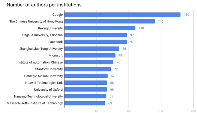 In terms of institutions; similar to ICML this year, Google takes the lead with 180 authors, followed by The Chinese University of Hong Kong with 140 authors and Peking University with 110 authors.