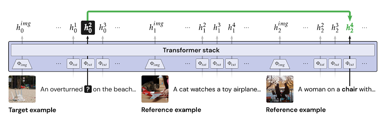 The model is based on the transformer model, and at each iteration, the model receives an episode of image and language pairs, and then meta-learns a policy to acquire word representations from the episode. This produces a representation that is able to acquire novel words at inference time as well as more robustly generalize to novel compositions. Specifically, every tasks is formulated as a language acquisition task or an episode, consisting of training examples and a testing examples, where the testing examples evaluates the language acquired from the training examples. In this figure above for instance, the model needs to acquire the word “chair” from the training samples, a word which it has never seen before. The meta-training is done in the forward pass, where the model needs to point to the correct word, “chair”, in the training example, and a matching loss is used to train the model. After training on many episodes and tasks, the model is able to adapt very quickly to novel task during inference.