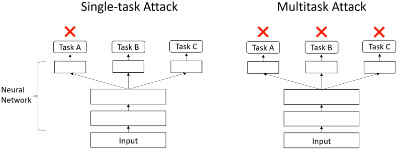 Using p-norm ball bounded attack, where the adversarial perturbation is found within a p-norm ball for a given radius of a given input example. Then, the vulnerability computed as the total loss change. The authors showed an improved robustness when training on a pair of tasks (eg., two tasks are chosen from: segmentation, depth, normals, reshading, input reconstruction, 2d and 3d keypoints…). The improved robustness is observed on single tasks attacks (ie., the perturbation is computed using one output) and multi tasks attacks (ie., the maximal perturbation of all the perturbations computed using all of outputs). The authors also theoretically showed that such a multi task robustness is only obtained if the tasks are correlated.