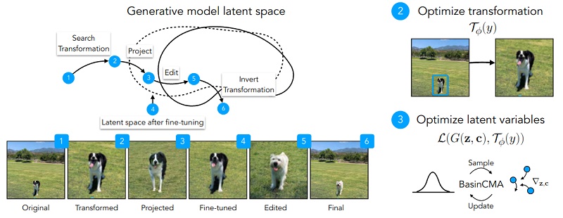 To address these problems, the paper proposes pix2latent with two new ideas: estimating input transformations at scale, and using a non-local search algorithm to find better solutions. As illustrated above, given an input image, pix2latent first finds the best transformation so that the transformed input is likely to be generated by a GaN, then the image is projected into the latent space using the proposed BasicCMA optimization method. The obtained latent variables are then edited, projected back into the image space obtaining an edited image, which can then be transformed with the inverse of the initial transformation