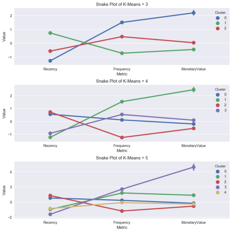 Recall that each information associated with a customer creates an additional dimension. The above image is obtained by flattening three-dimensional graphs (created from Recency, Frequency, and MonetaryValue) into two-dimensional graphs for ease of visualisation.
