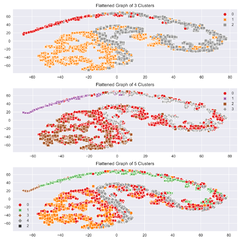 Nonetheless, it is a common practice to implement K-means clustering on +/- 1 of optimal cluster identified; here, it is 3, 4, and 5 clusters.
