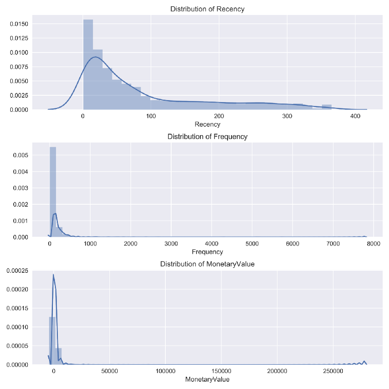 I first check for skewness of data by plotting a distribution plot of Recency, Frequency, and MonetaryValue: