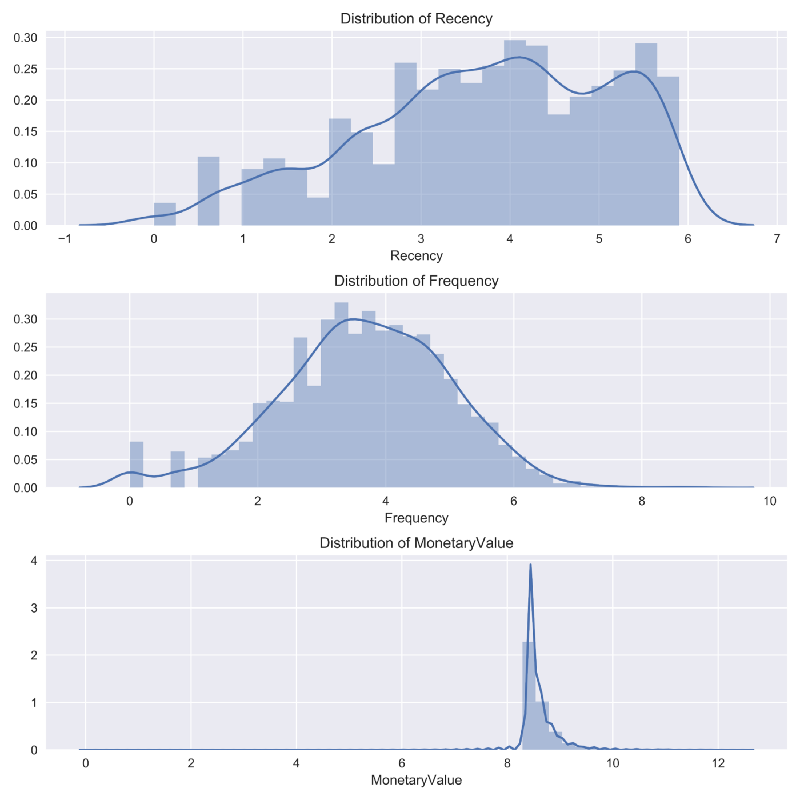 I performed log transformations to reduce the skewness of each variable. Below is the distribution plots of RFM after log transformation: