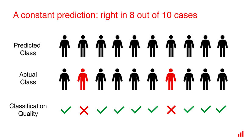 A savvy machine learner knows the trick. The sizes of our two classes are far-from-equal. In this case, the accuracy metric is of little use. Even though the numbers might look good “on paper.”