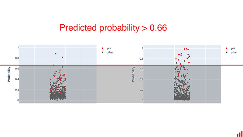 The output of a probabilistic model is a number between 0 and 1. To use the prediction, we need to assign the label on top of these predicted probabilities. The “default” approach for binary classification is to cut at 0,5. If the probability is higher, the label is a “yes.”