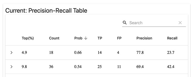 To be more specific, let’s look at the precision-recall table. It aims to help with the choice of threshold in similar situations. It shows different scenarios for top-X predictions.