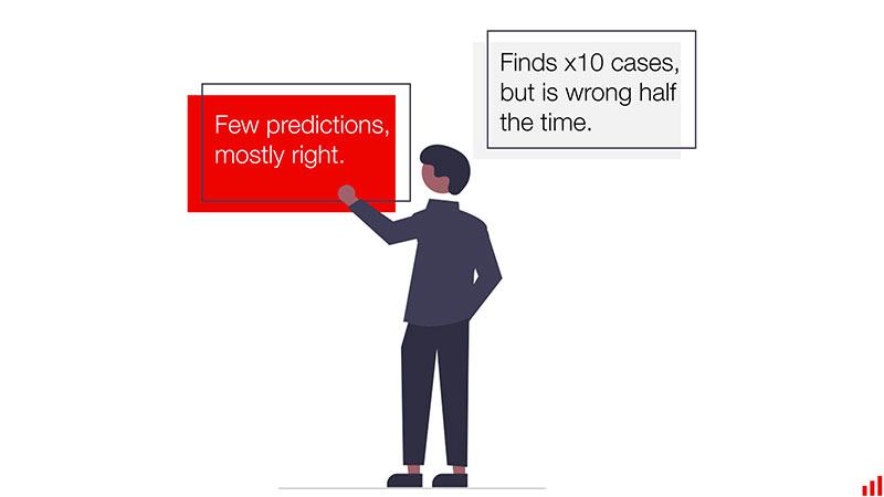 However, we might appreciate a model’s ability to pick a few cases with high conviction. For example, if we consider the cost of false positives to be very high. Making a cut-off at 0,8 would give a precision of 100%. We would make only two predictions, but both would be right.