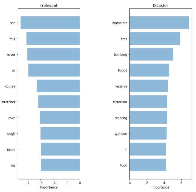 To validate our model and interpret its predictions, it is important to look at which words it is using to make decisions. If our data is biased, our classifier will make accurate predictions in the sample data, but the model would not generalize well in the real world. Here we plot the most important words for both the disaster and irrelevant class. Plotting word importance is simple with Bag of Words and Logistic Regression, since we can just extract and rank the coefficients that the model used for its predictions.