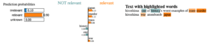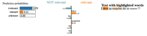 We split our data in to a training set used to fit our model and a test set to see how well it generalizes to unseen data. After training, we get an accuracy of 75.4%. Not too shabby! Guessing the most frequent class (“irrelevant”) would give us only 57%. However, even if 75% precision was good enough for our needs, we should never ship a model without trying to understand it.
