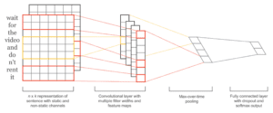 Convolutional Neural Networks for Sentence Classification train very quickly and work well as an entry level deep learning architecture. While Convolutional Neural Networks (CNN) are mainly known for their performance on image data, they have been providing excellent results on text related tasks, and are usually much quicker to train than most complex NLP approaches (e.g. LSTMs and Encoder/Decoder architectures). This model preserves the order of words and learns valuable information on which sequences of words are predictive of our target classes. Contrary to previous models, it can tell the difference between “Alex eats plants” and “Plants eat Alex.”