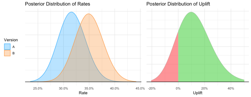 However, Bayesian A/B testing does have a metric that does not have a parallel in the frequentist framework: The Risk. We calculate the risk for both A and B, and it’s interpretation is: “If I chose B when B is actually worse than A, how much will I lose?”. This metric is also used as a decision rule in the A/B test.