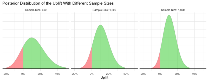 The Risk has two major advantages over the P-value. First of all, it’s threshold is in business jargon (“what is the cost I am willing to pay if I’m wrong?”), while the frequentist significance level is statistical gibberish (“what is the type-I error rate I am willing to accept?”). Second, it’s much more robust to sequential examination (“peaking”) than the P-value, and as a result the sample size doesn’t have to be pre-determined when using the Bayesian framework. This is also a major advantage of Bayesian A/B testing.