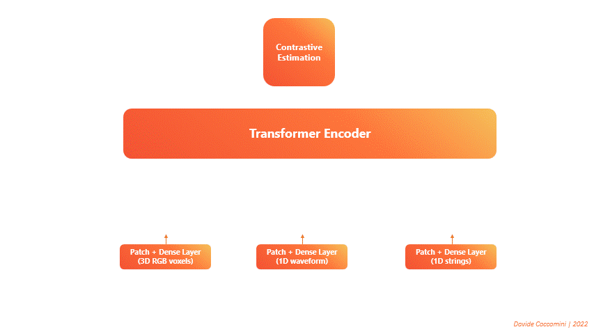 To do this, the proposed architecture is composed of a single Transformer Encoder on which three distinct forward calls are made. One call for each type of input data is always transformed into a sequence of tokens. The transformer takes these sequences as input and returns three distinct sets of features. Then the features are given in input to a contrastive estimation block that calculates a single loss and performs the backward.