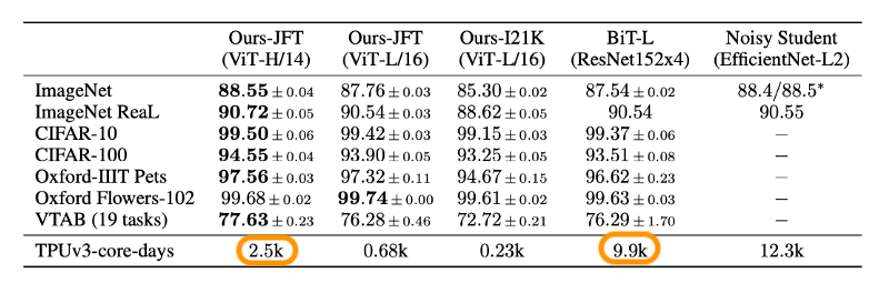 - The pure transformer architecture (ViT) is more efficient and scalable than traditional CNNs (ResNet BiT) at both smaller and larger compute scales.