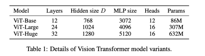 Like other popular Transformer models (GPT, BERT, RoBERTa), the ViT (vision transformer) comes with different model sizes (Base, large, and huge) and different number of transformer layers and heads. For example, ViT-L/16, can be interpreted as a large (24 layers) ViT model with 16 x 16 input image patch size.